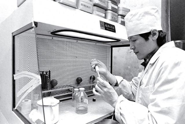 1987年12月14日,马军在实验台前做检验。受访者供图