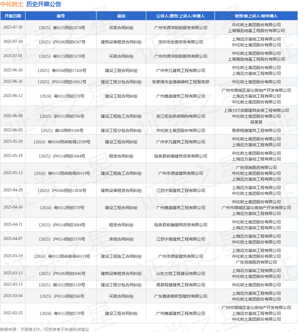 案号:(2025)粤0115民初1678号审理法院:广州市南沙区人民法院案由:买卖合同纠纷当事人信息: 原告/上诉人:广州市源洋船舶服务有限公司 被告/被上诉人:中化岩土集团股份有限公司、上海强劲地基工程股份有限公司开庭日期:2025年7月1日根据统计,近一年内以中化岩土集团股份有限公司为当事人的历史开庭公告有41则,其中案由为“建设工程合同纠纷”的公告以8则居首,其次为“买卖合同纠纷”有6则,“建设工程施工合同纠纷”有6则。历史开庭公告(前20条)如下: