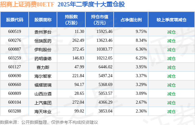 从基金规模来看,招商上证消费80ETF基金2025年二季度公布的基金规模为16.33亿元,较上一期规模18.38亿元变化了-2.05亿元,环比变化了-11.14%。该基金最新一期资产配置为:股票占净值比99.44%,无债券类资产,现金占净值比0.62%。从基金持仓来看,该基金当季前十大股票仓位达49.43%牛融网,第一大重仓股为贵州茅台(600519),持仓占比为9.75%。