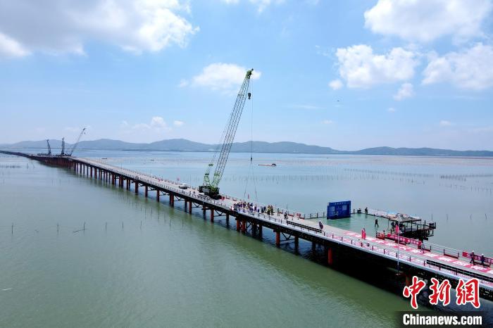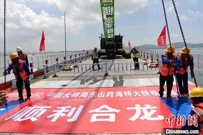 6月12日,随着最后一块桥面板缓缓落下,漳汕高铁东山跨海特大桥栈桥顺利合龙。中新网记者张金川摄